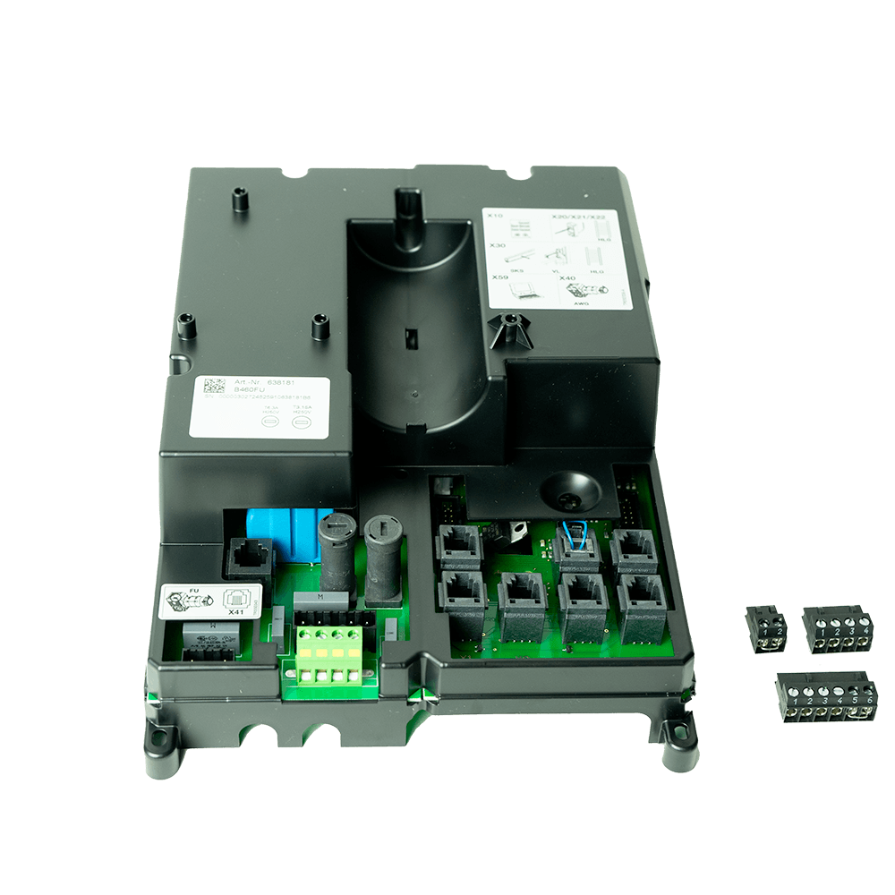Die Hörmann Hauptplatine B460FU wird in Torsteuerungen eingesetzt, die variable Motorfrequenzen benötigen – z. B. für sanftes Öffnen, gebremstes Schließen oder definierte Geschwindigkeitsprofile. Der Einbau erfolgt direkt im Steuerungsgehäuse, alle Steck- und Sicherheitsanschlüsse müssen gemäß Hörmann-Vorgaben gesetzt werden.