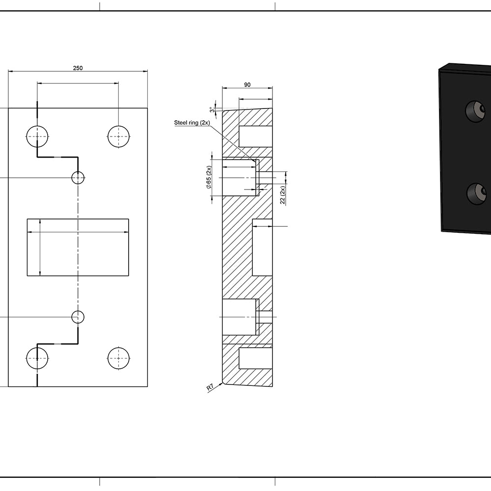 The approach buffer is mounted directly on the loading bridge or ramp. The standardized hole spacing of 250 mm allows for easy and secure attachment to concrete or steel structures.